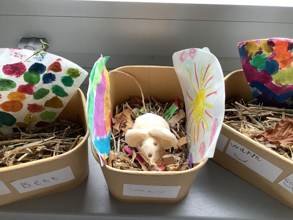 Anlässlich des bundesweiten Vorlesetages wurde in der Klasse 1a das Bilderbuch Frederick vorgelesen und ein Buchprojekt dazu durchgeführt. Genauso wie die Mäuse in dem Bilderbuch sind die Kinder auf die Suche nach Vorräten gegangen. Dabei war allen klar, neben Vorräten wie Nüssen und Stroh sind Fredericks Vorräte wie Sonnenstrahlen, Sommerfarben und wärmende Wörter ebenso bedeutend. Kleine Salzteig-Mäuse kuschelten sich am Ende in ihr warmes Nest.